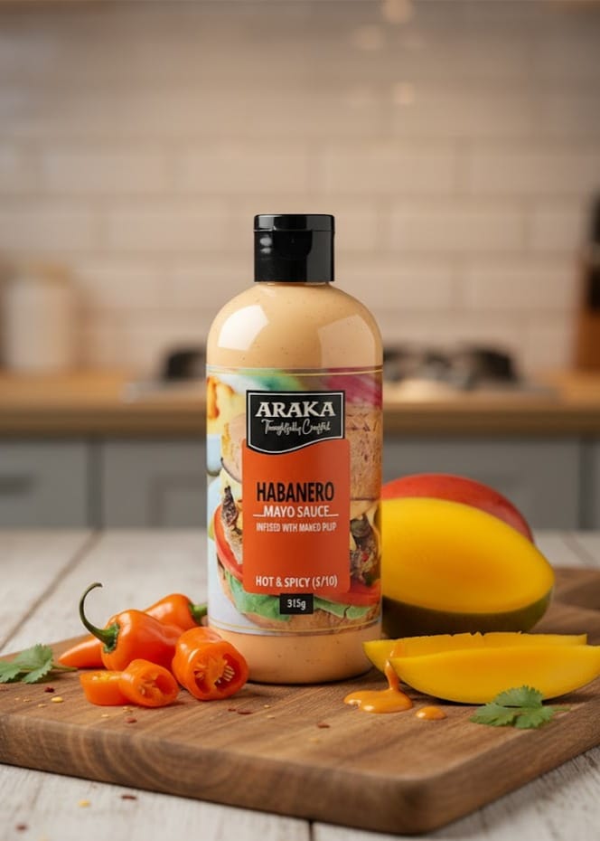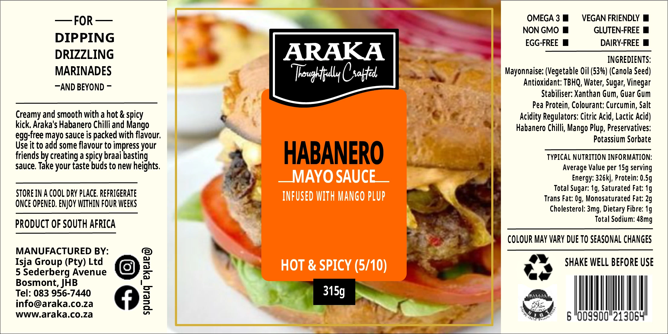 Creamy and smooth with a hot and spicy kick. Araka’s Habanero and Mango egg-free mayo sauce is packed with flavour. Use it to add flavour to impress your friends by creating a spicy braai basting sauce. Take your taste buds to new heights. Works well on burgers, wraps, sandwiches and salads too.