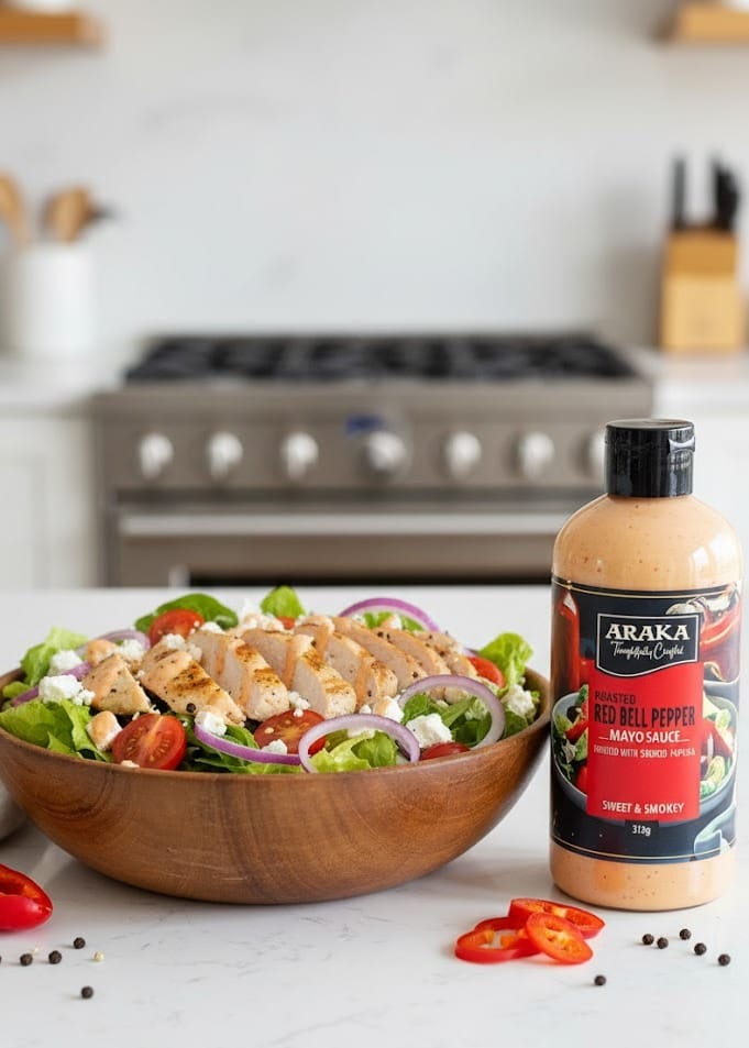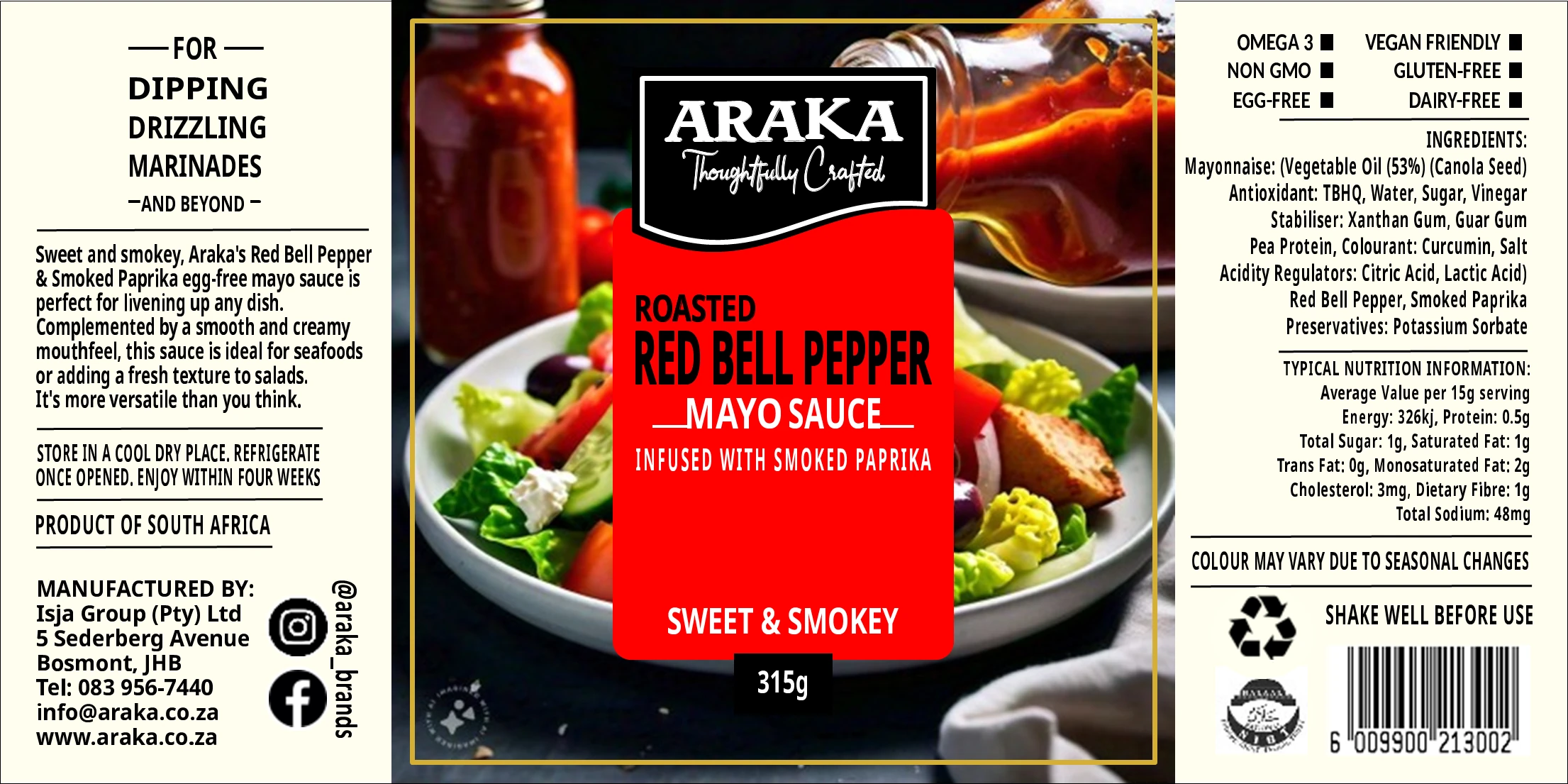 Sweet and smokey, Araka’s Roasted Red Bell Pepper and Smoked Paprika egg-free mayo sauce is perfect for livening up any meal. Complemented by a smooth and creamy mouthfeel. This sauce is ideal for seafood’s or adding a fresh texture to salads. It’s more versatile than you think.